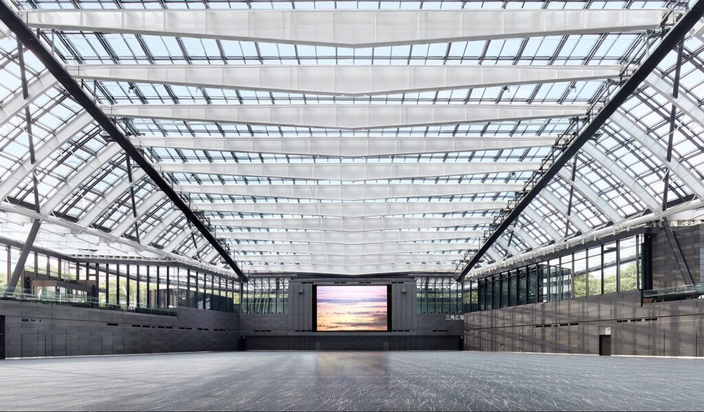 天井高は最大約25mで、4K・564インチの大型ビジョンなど設備も充実。