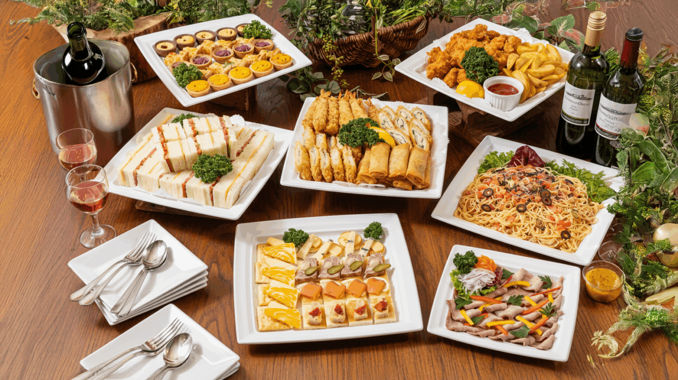 ・使い捨て容器でお届けするデリバリープランです。設置・配膳・撤収等のサービスはついておりません。